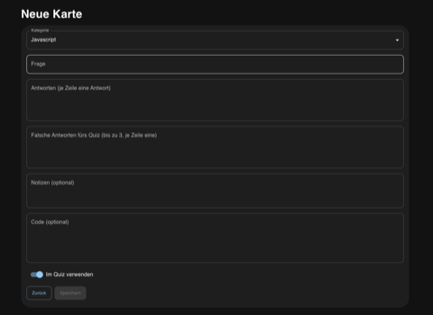 Erstelle eigene Lernkarten, lerne im Study‑Modus und teste dich im Quiz. Kategorien helfen dir, alles übersichtlich zu halten.
